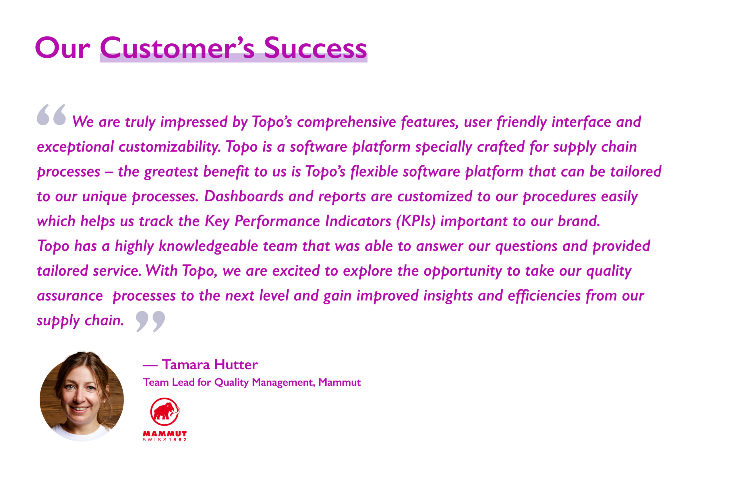 The highly customizable dashboard offered by Topo ensures that Mammut can tailor the solution to its specific requirements.